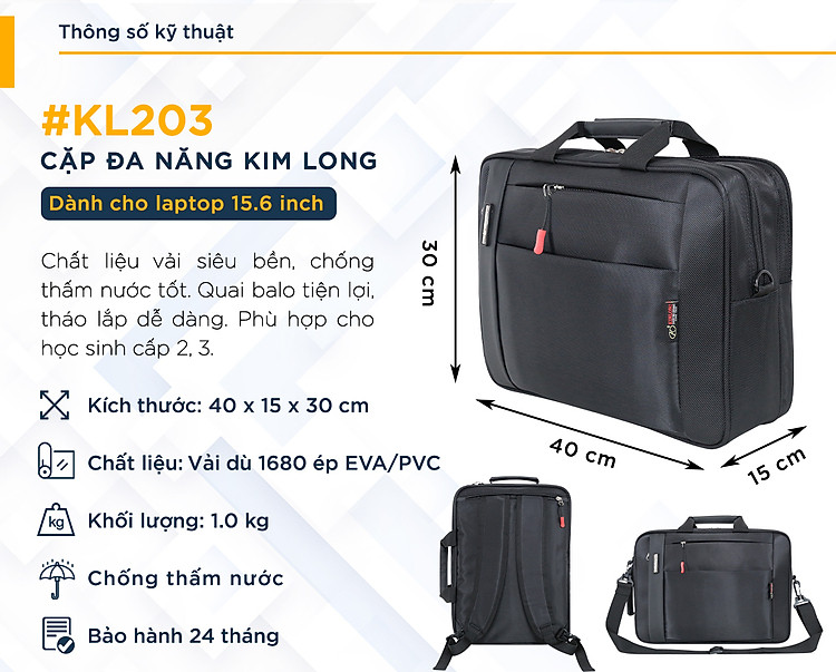 - Cặp đa năng Kim Long KL203 có ngăn chính rộng rãi giúp bạn thoải mái đựng đồ đạc, tài liệu. Ngăn đựng laptop có dây cố định giúp bảo vệ laptop khỏi va đập