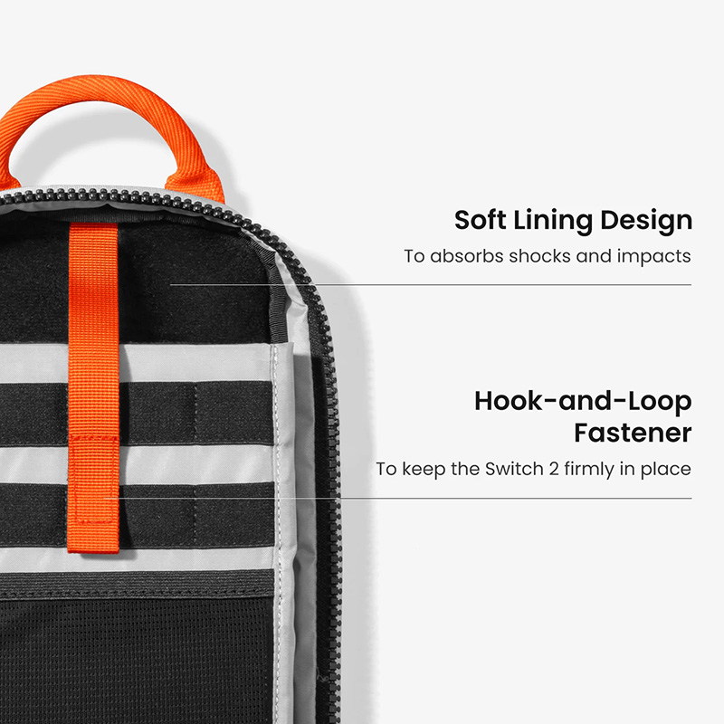 • Ngăn chính với lớp lót mềm mại và dây đai Velcro giữ chặt Switch 2 của bạn.