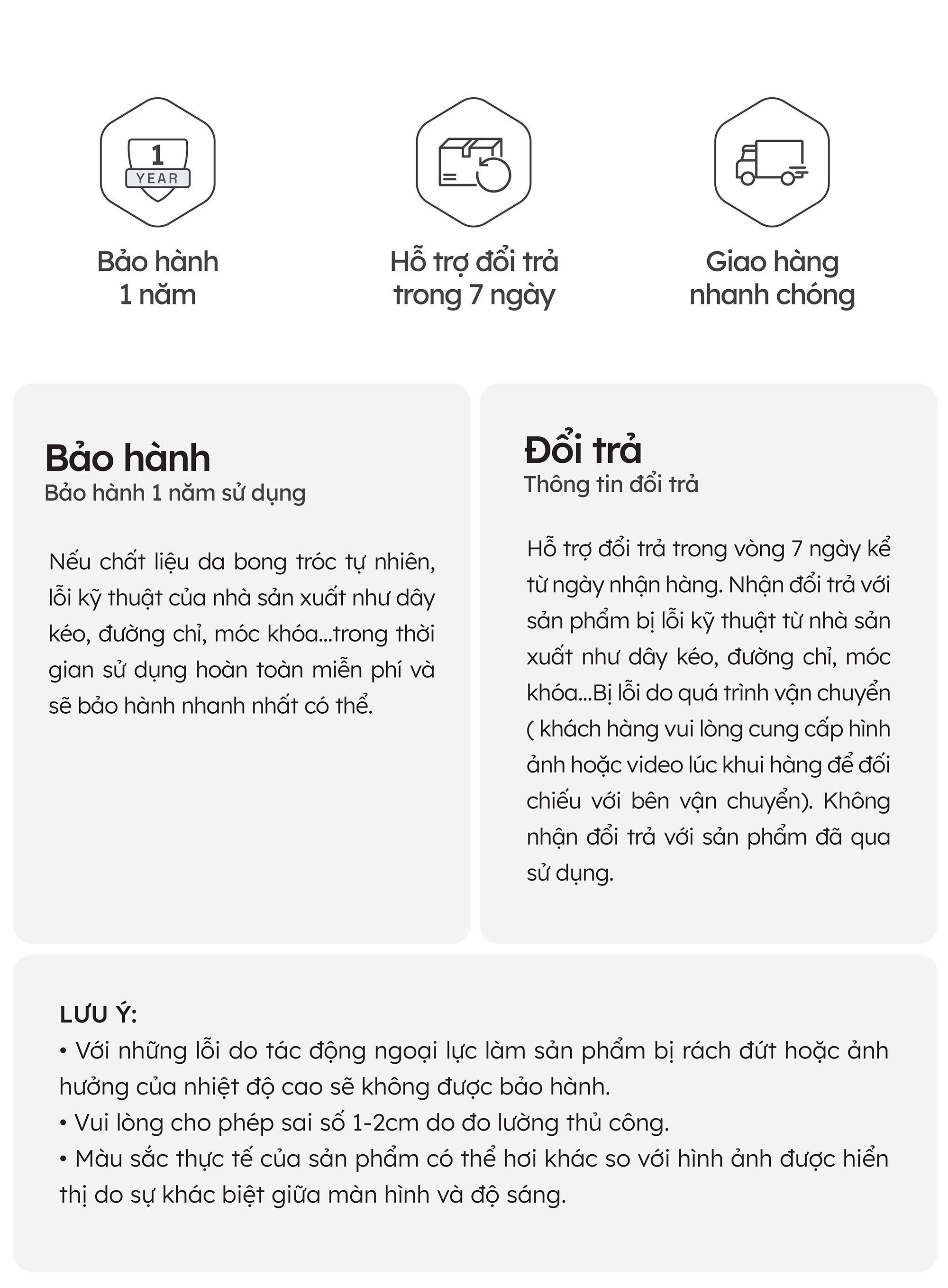 - Nhận đổi trả với sản phẩm bị lỗi kỹ thuật từ nhà sản xuất như dây kéo, đường chỉ, móc khóa…