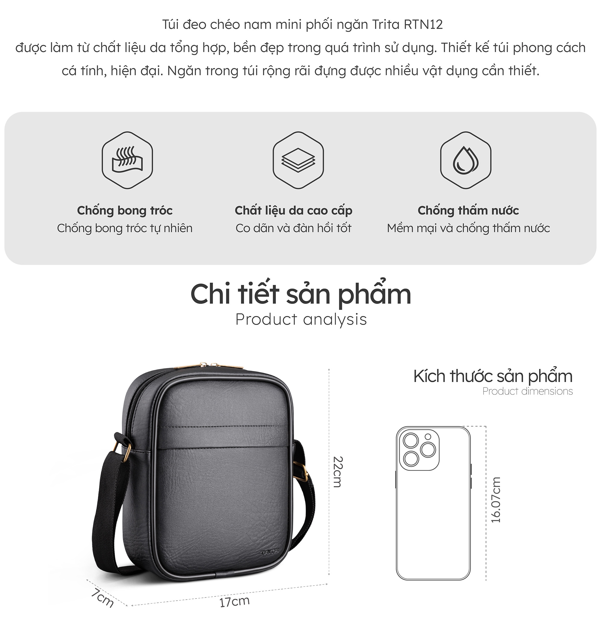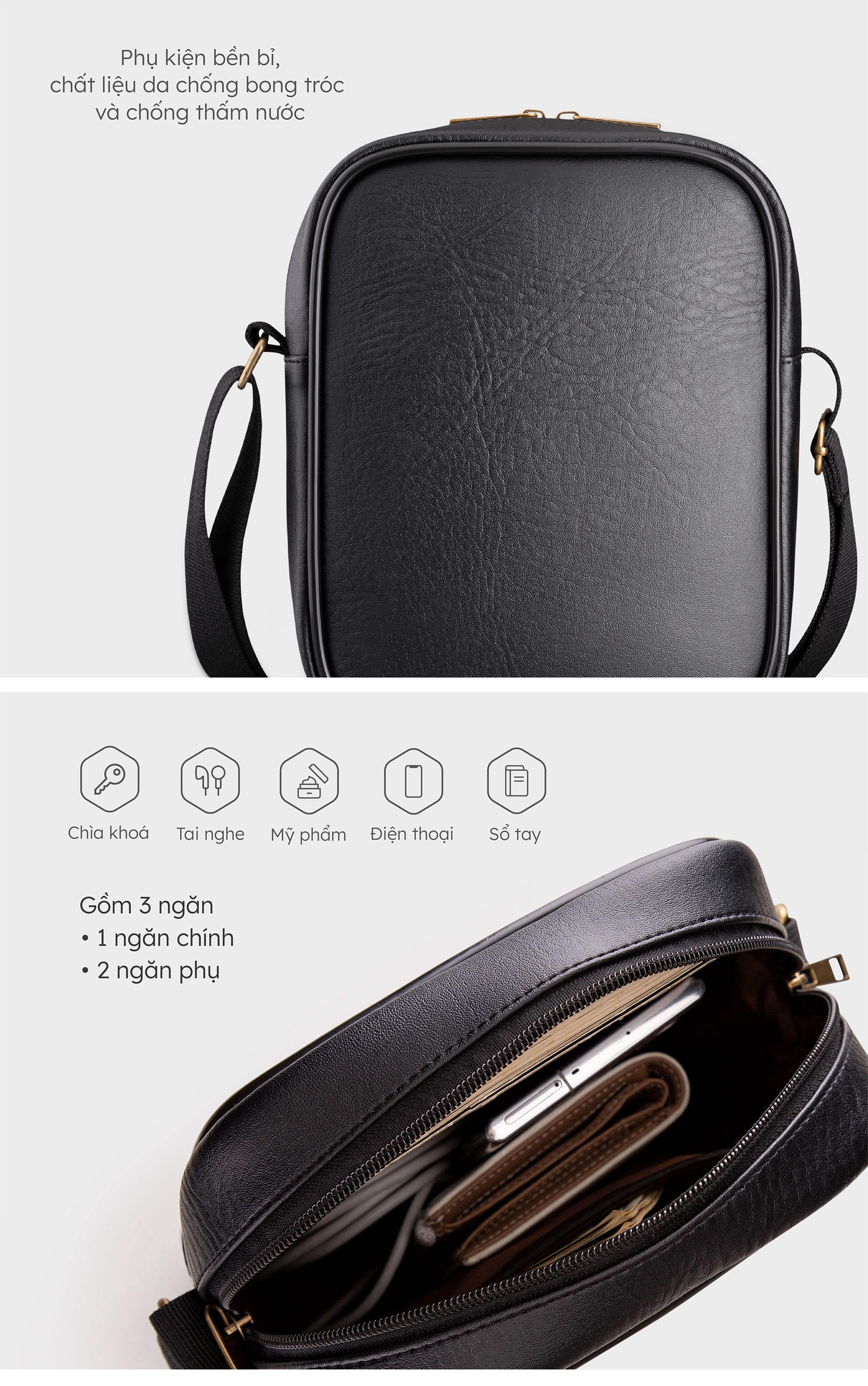 RTN12 là mẫu túi đeo chéo nam với thiết kế tối giản, gam màu đen sang trọng và mạnh mẽ. Sản phẩm làm từ da tổng hợp cao cấp, tỉ mỉ trong từng đường khâu. Túi có kiểu dáng hình chữ nhật, được trang bị khóa kéo ở cả ngăn chính và ngăn phụ để bảo quản chắc chắn đồ dùng của bạn. Bạn có thể sử dụng chiếc túi đeo chéo này trong mọi hoàn cảnh, từ đi chơi đến đi làm đều phù hợp cả.