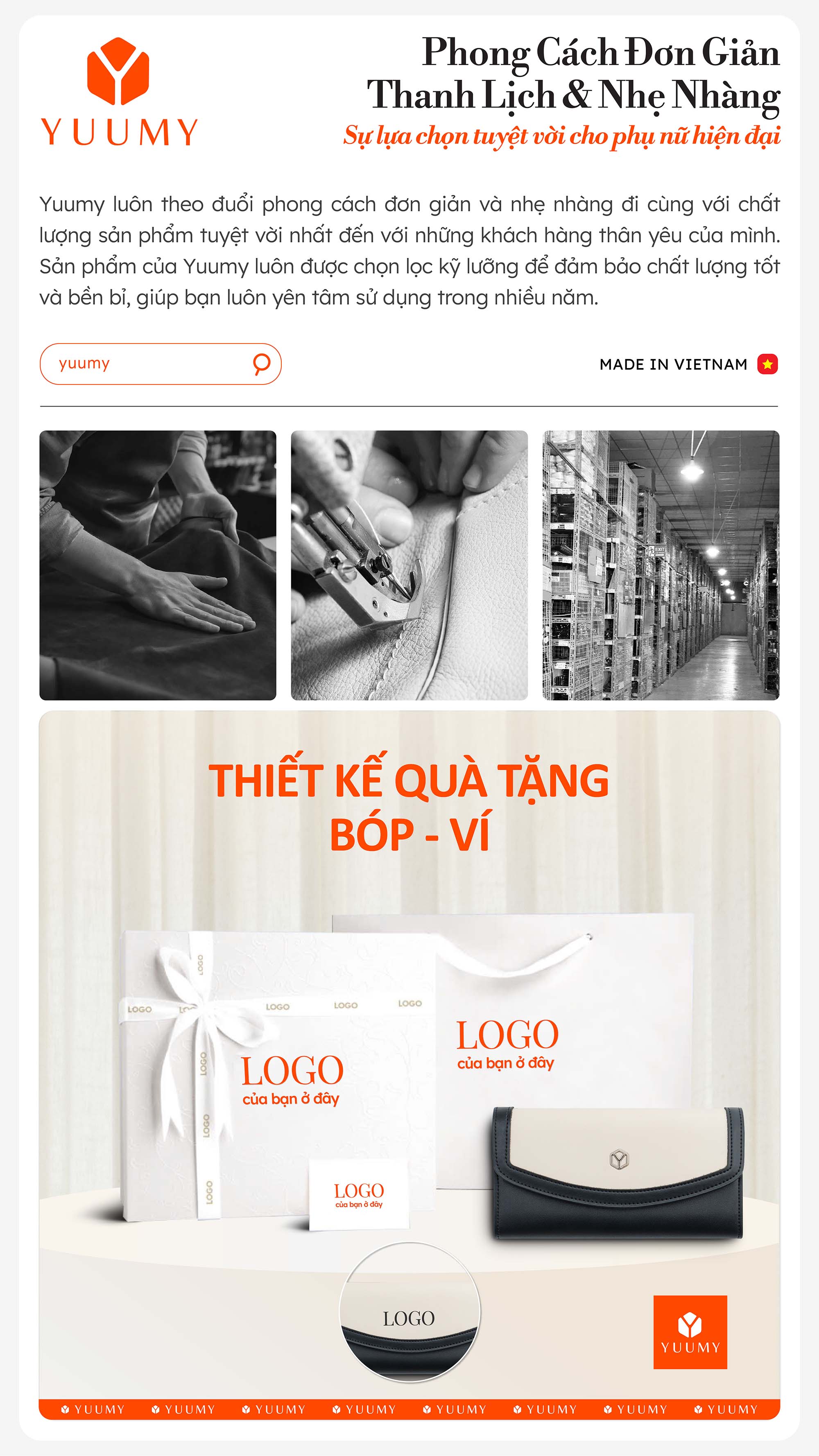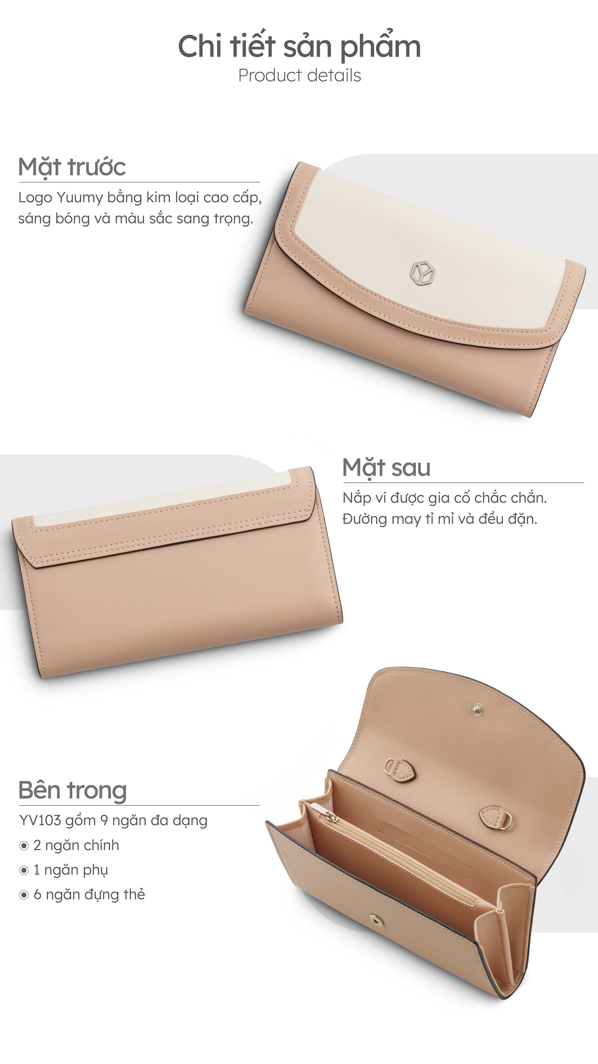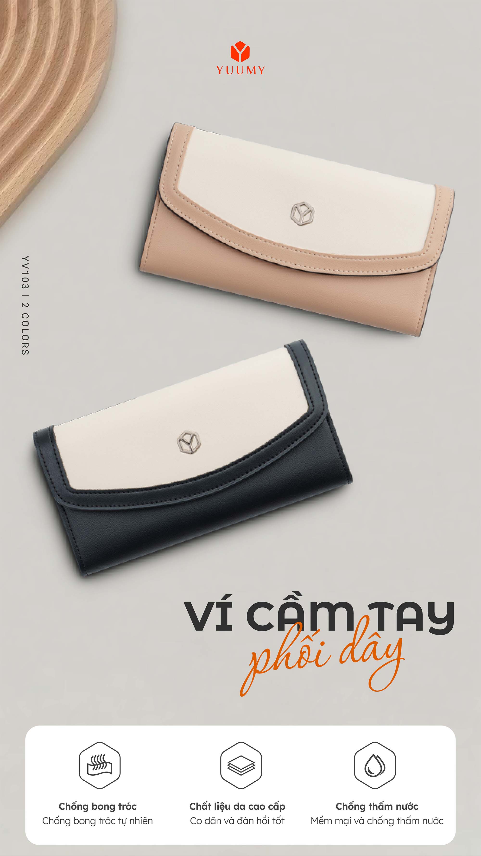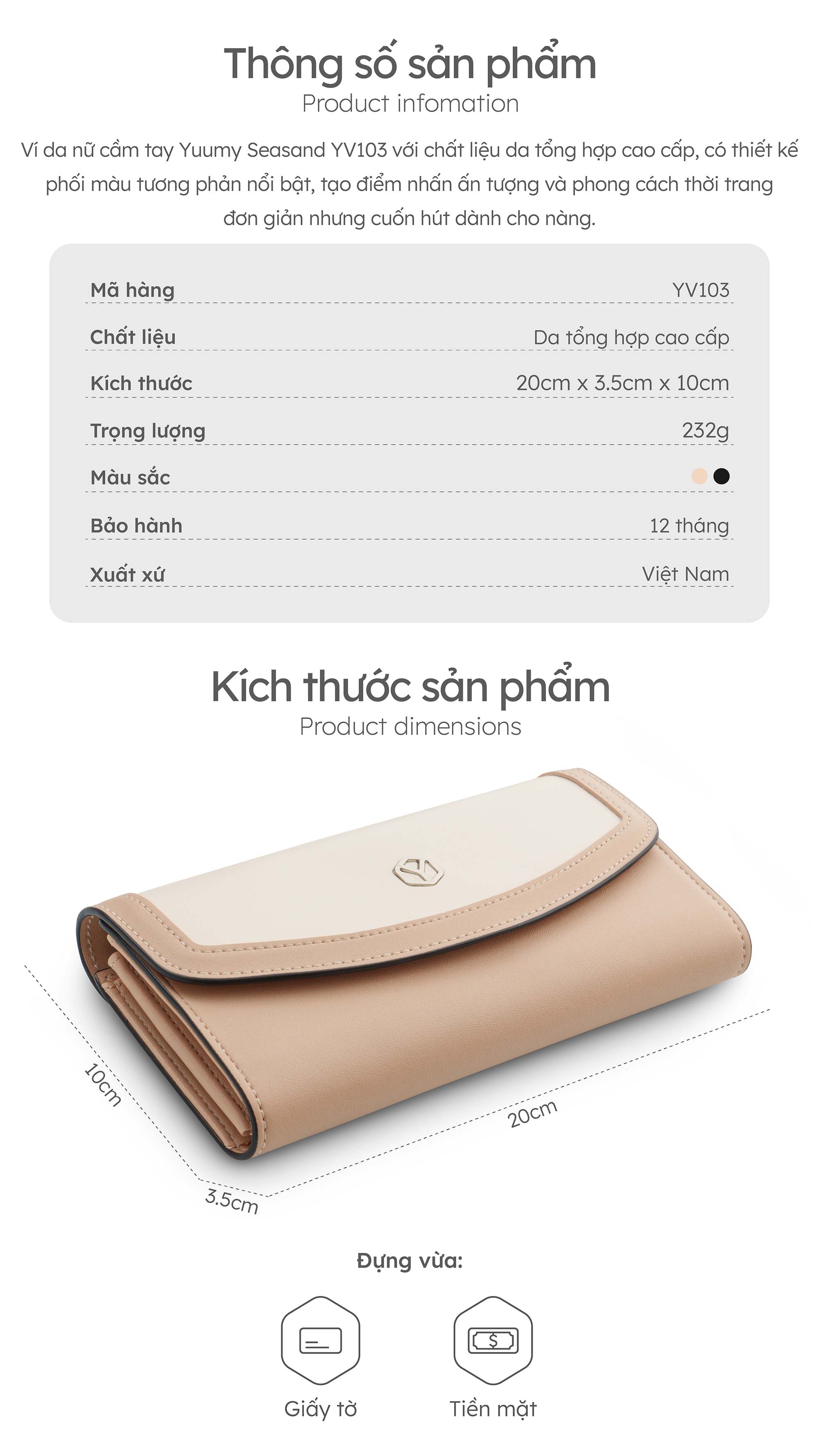 Ví da nữ cầm tay Yuumy Seasand YV103 có thiết kế phối màu tương phản nổi bật, tạo điểm nhấn ấn tượng và phong cách thời trang đơn giản nhưng cuốn hút dành cho nàng. Chất liệu da tổng hợp bền đẹp. Sản phẩm đi kèm với dây đeo có thể tháo rời, giúp bạn linh hoạt trong việc sử dụng ví như một chiếc túi cầm tay hoặc đeo chéo. Ví có kích thước nhỏ gọn, lý tưởng để cầm tay hoặc bỏ vào túi xách. Ví được thiết kế với nhiều ngăn chứa tiện lợi có thể sắp xếp tiền mặt, thẻ tín dụng, giấy tờ cá nhân và các vật dụng nhỏ Thiết kế đơn giản nhưng hiện đại của YV103 phù hợp với nhiều phong cách trang phục khác nhau cùng nàng đi làm, đi chơi, dạo phố,
